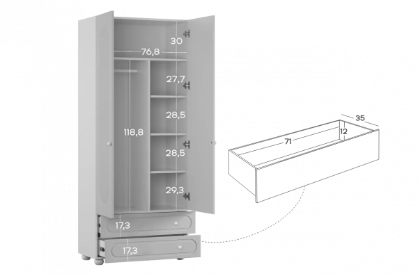 Слева внутри шкафа расположена штанга для плечиков, предназначенная для хранения одежды на вешалках. Правая часть оборудована полками, которые подойдут для аккуратного размещения сложенной одежды, коробок или аксессуаров. В нижней части предусмотрены два вместительных выкатных ящика для хранения, обеспечивающих дополнительное место для вещей повседневного использования.